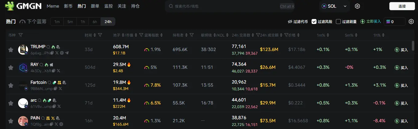 过去 24h Solana 热门代币前五依次为:TRUMP 、RAY 、Fartcoin、arc 、PAIN