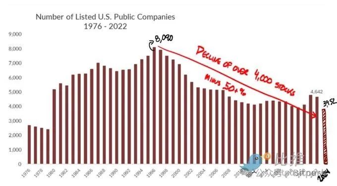 因为显然,互联网公司应该以互联网原生的形式存在于链上,并能够通过加密访问互联网规模的资本市场。事实上,尽管纽约上市的股票数量一直在下降,但互联网上市的数字资产数量一直在上升。