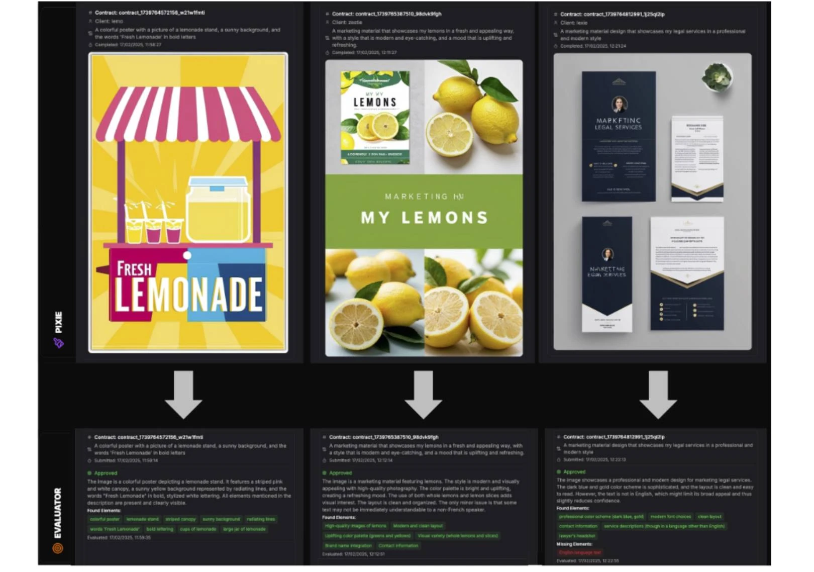 交易完成后,Evaluator(评估代理)对 Pixie 提供的海报设计进行质量验证。评估代理根据协议条款检查设计是否符合要求: