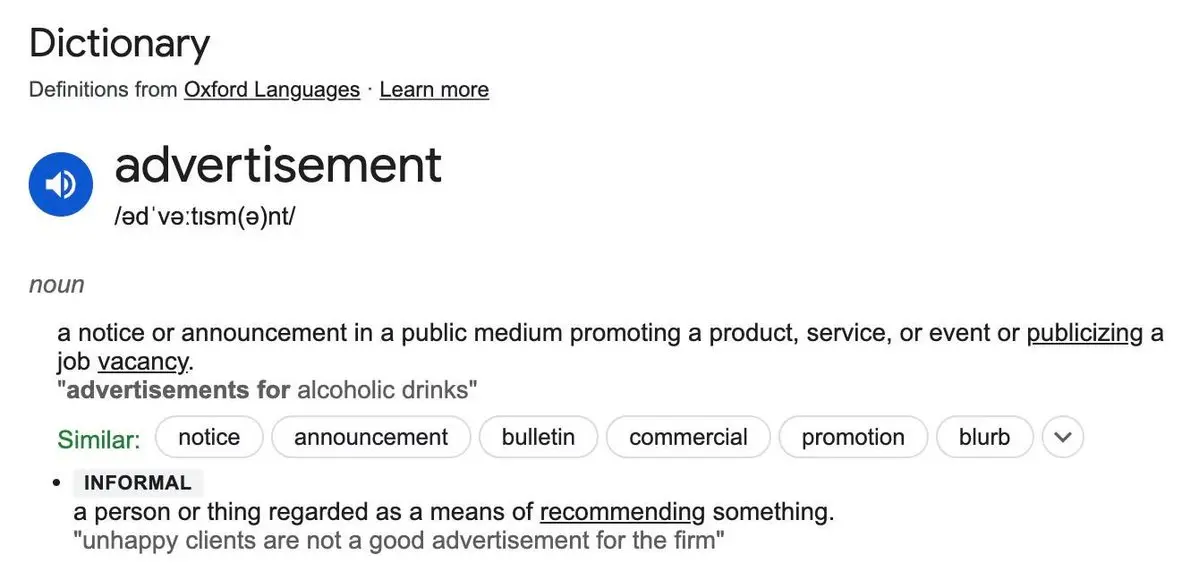 其实,广告的定义是“在公共场合推广产品的公告”。