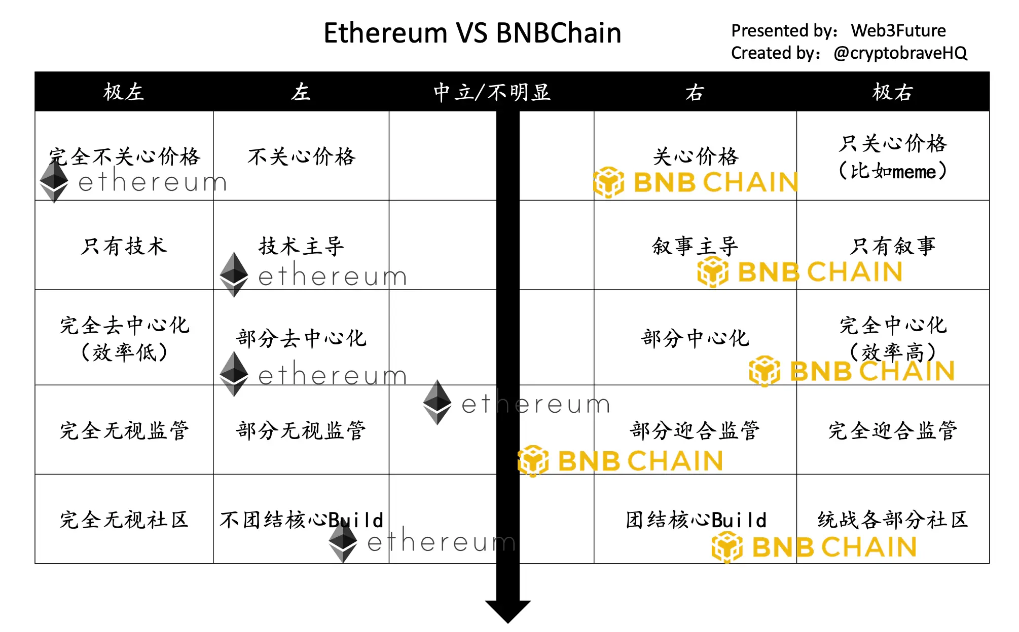 我们再看下Ethereum 和 BNB Chain对比。不难发现当下的 BNB Chain 比 Solana “更右”。因为要 BNB Chain 要通过meme 和AI Agent 等生态战略与 Solana 竞争,只能比Solana 更中心化、注入更强大的资本和操盘资源(联动投资、上币、做市等)、更团结社区。