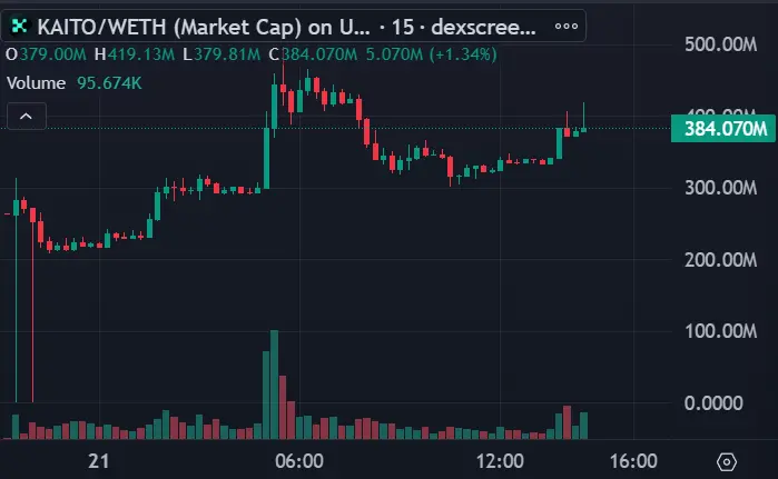 而 KAITO 的受欢迎程度也使其立刻获得了币安的青睐,并上线了币安 HODLer 空投(占总量 2%)。截至发稿前,KAITO 代币报 1.60 美元,市值达 3.86 亿美元,距离低点也几近翻倍。