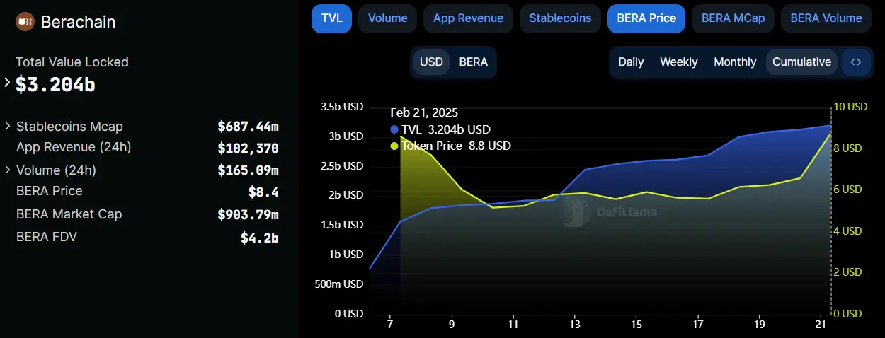 在代币经济学上,16.8% 分配给初始核心贡献者;34.3% 分配给投资者;28.9% 分配用于现在和未来的社区激励;20% 分配给生态系统和研发。在币价表现上,尽管由于此前的市场趋势导致 BERA 代币下探到 4.7 美元位置,但随着 2 月 13 日以后 TVL 的稳步上升,带动了 BERA 代币的币价稳定并随着市场回暖加速资金流入,截至发稿前 BERA 最高触及 9.62 美元,市值也达到 9 亿美元,距离低点已有接近翻倍涨幅。