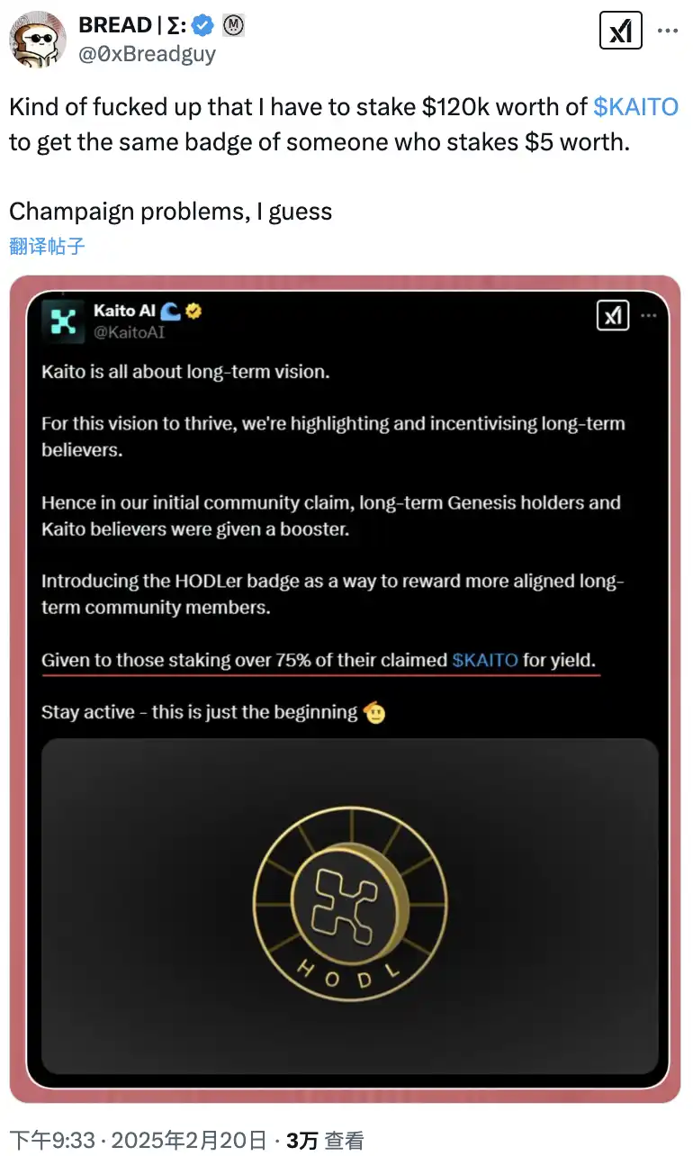针对这一点,有 KOL 列出了自己的数据。@0xBreadguy提到,「有点离谱的是,我得质押价值 12 万美元的 $KAITO 才能获得与质押价值 5 美元的人相同的徽章。」