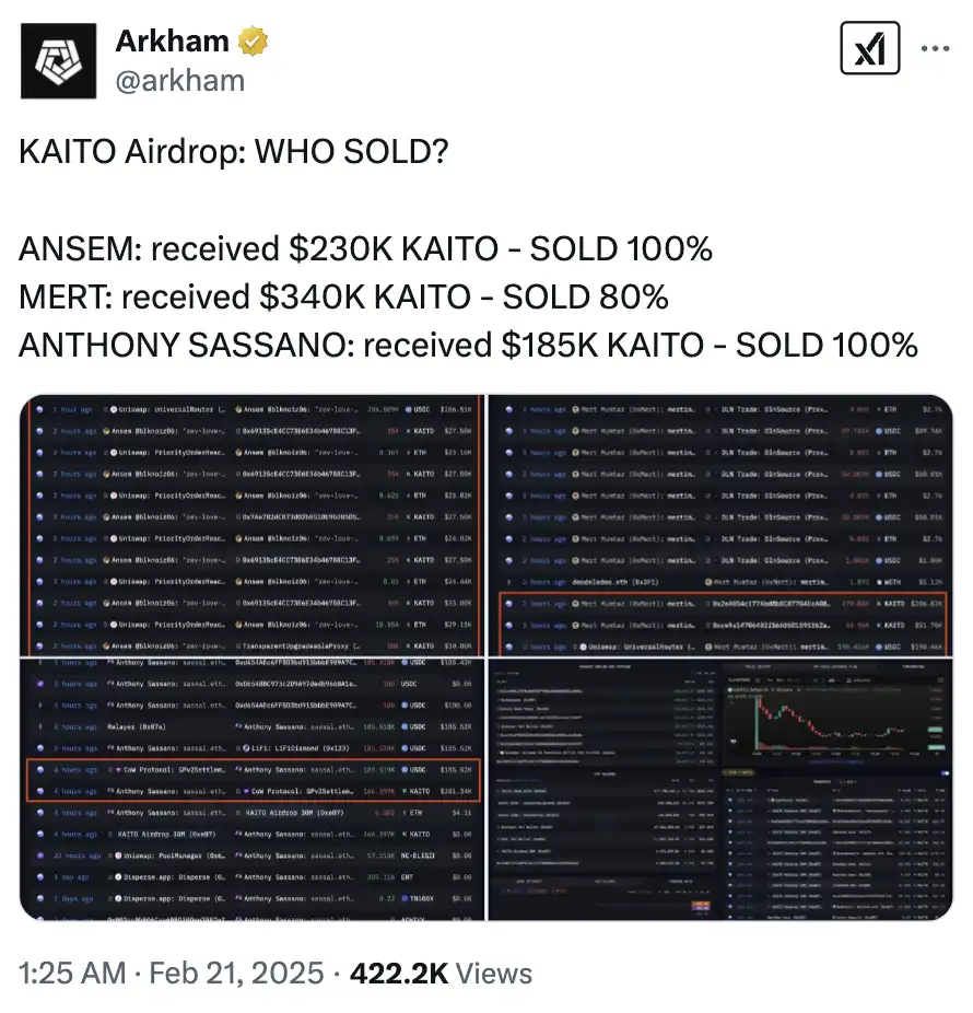 就在社区围绕 Kaito 空投展开激烈讨论的同时,另一个发币的 AI 数据工具在 21 日晒出了一张 KOL 收到 Kaito 的空投金额,以及用自家 AI 工具分析出的 KOL 卖出比例。其实这回并不是第一次数据工具发币了。之前 Binance 就曾上线 Launchpad 项目 Crypto 数据分析平台 Arkham(ARKM)也是一个链上数据情报分析平台,它通过 AI(Ultra 引擎)将区块链地址与现实世界实体关联,提供交易行为的洞察和分析。