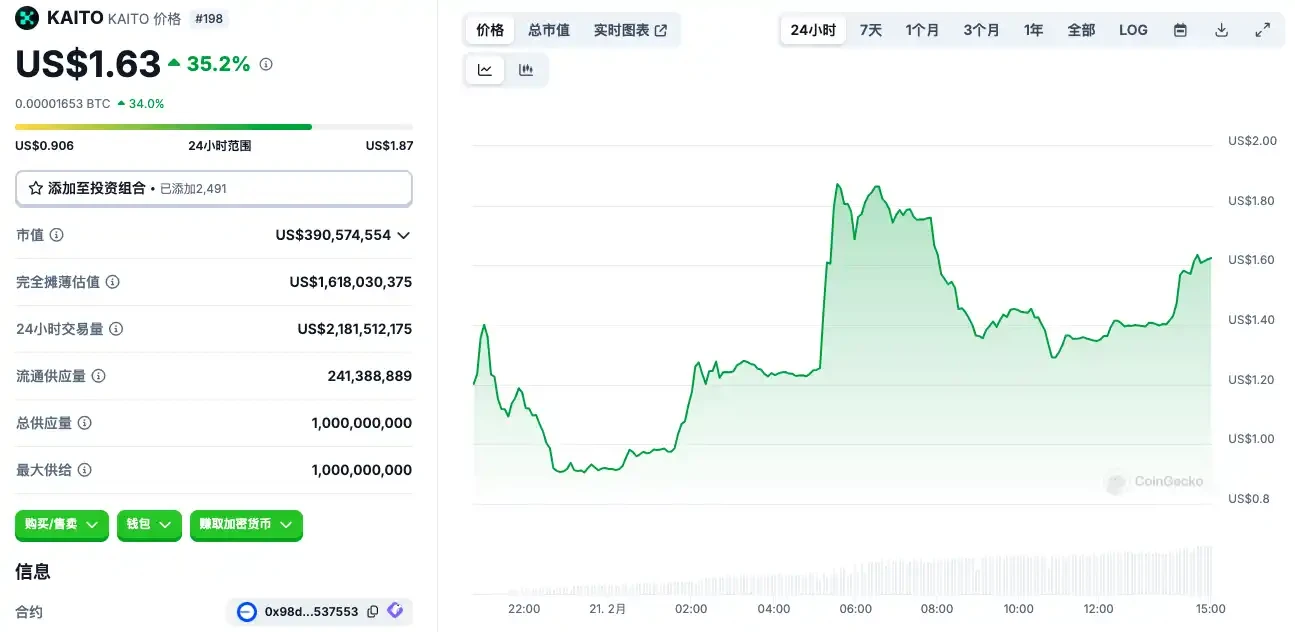 KAITO 上线之后,市场表现相对稳定。根据行情数据显示,相比一些首日跌幅超 50% 的空投项目,Kaito 空投当天的价格波动控制在 30% 左右。