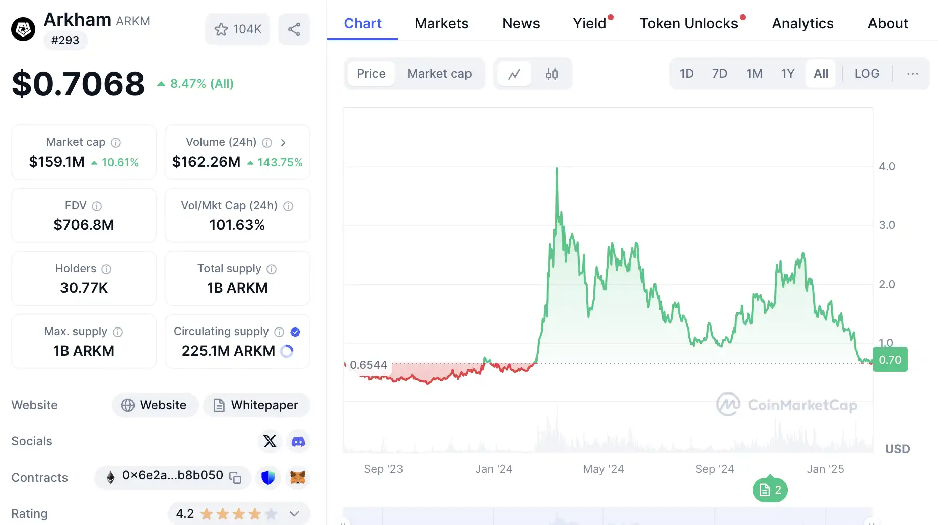 和 Kaito 类似,Arkham 也被归类为 AI 数据工具,目标都是通过技术手段解析加密世界的信息碎片化问题,为用户提供「Alpha 机会」。不同的是,Kaito 更偏向社交数据,而 Arkham 聚焦链上数据。那么第一个给数据工具发币的 Arkham 现状如何呢?就价格而言,根据行情数据显示,$ARKM 当前价格为 0.71 美元,其历史最高价为 2024 年 3 月 10 日的 3.12 美元,当前价格较之跌幅近 80%,显示出较大波动性。或许是因为被归入 AI 项目的原因,价格随整个 AI 板块的兴衰有所起伏。