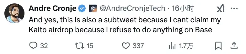 首先是 Sonic Labs 创始人 Andre Cronje 在社交媒体发文表示,「由于我永远无法理解的理由,Coinbase 已经 8 年拒绝上线 S。同时因为我拒绝在 Base 上做任何事情,所以无法申领 Kaito 空投。」