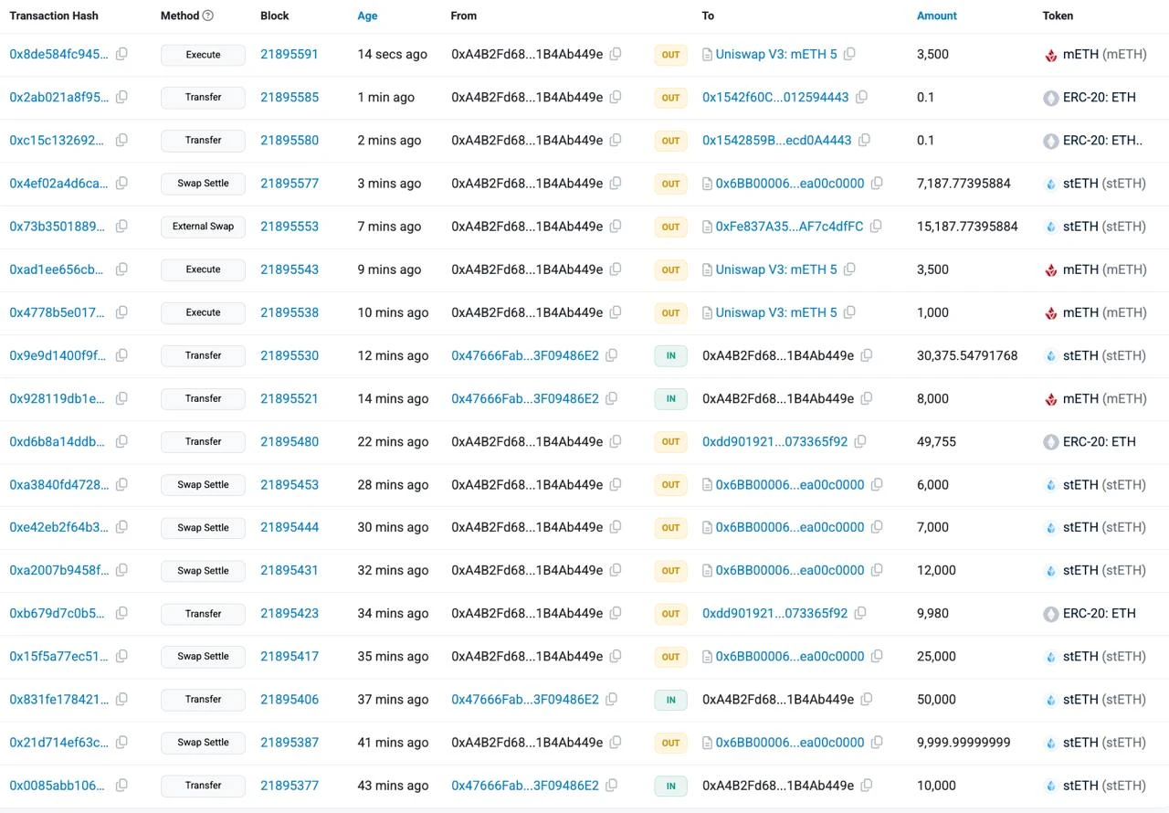 当时可以确定的消息是,黑客相关地址为 0x47666Fab8bd0Ac7003bce3f5C3585383F09486E2;在盗取资金后,其在 DEX 上将 mETH & stETH 快速兑换为了 ETH。