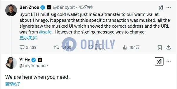 事件发生后,CZ 回复 Ben Zhou 推文表示:“这不是一个容易处理的情况。建议暂时停止所有提款,作为标准的安全预防措施。如有需要,将提供任何帮助。”币安联创何一回应 Bybit 首席执行官 Ben Zhou 称,“若有需要将提供支持”。