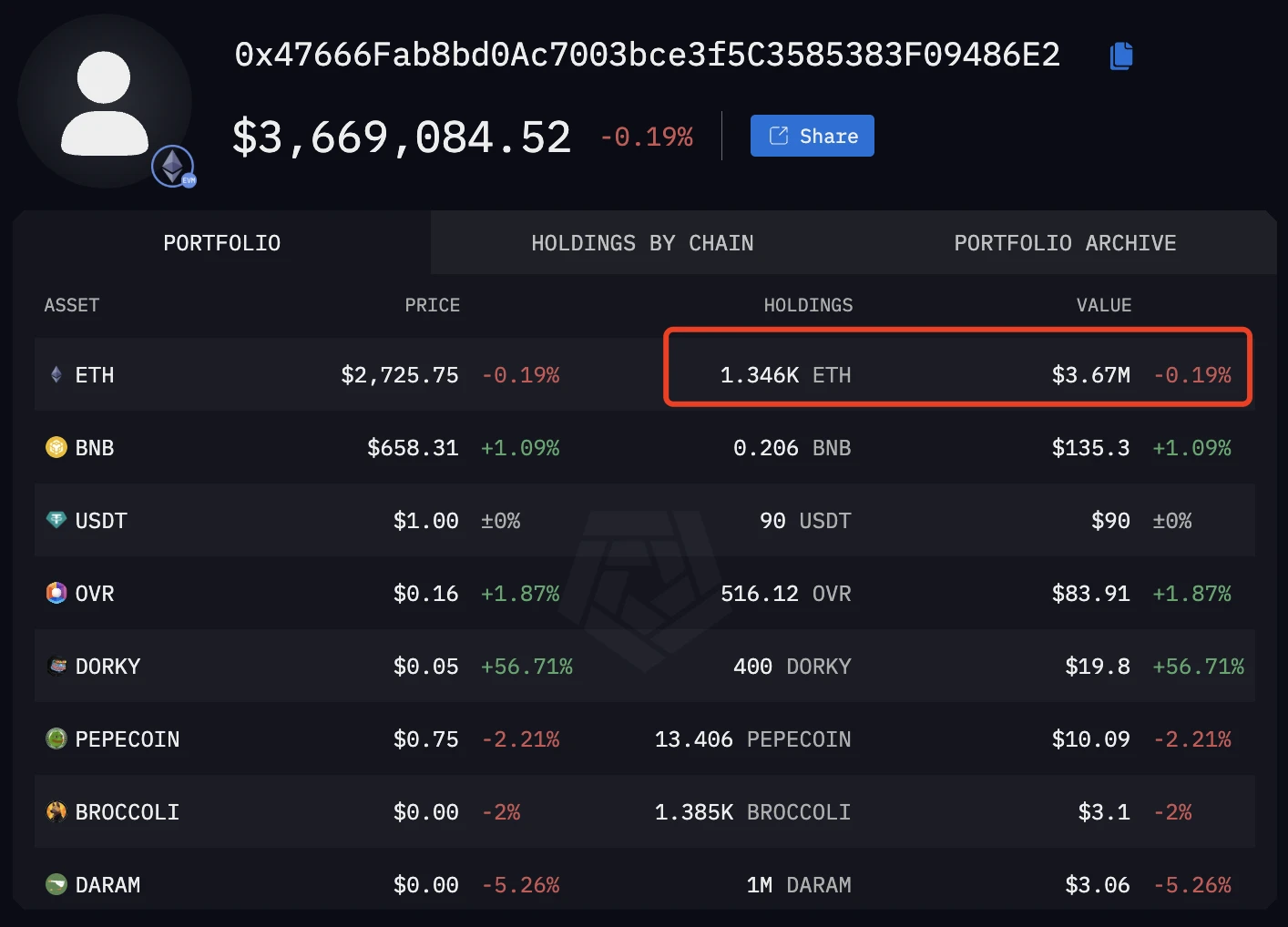 仅剩余 366.9 万美元资产,其中 ETH 持仓量骤减至 1346 枚。