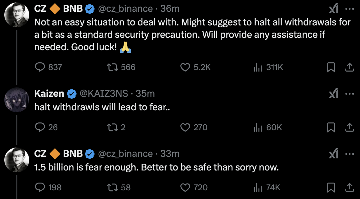 币安CZ:「被骇15亿镁很严重,建议Bybit关闭提款」,有需要我能帮忙