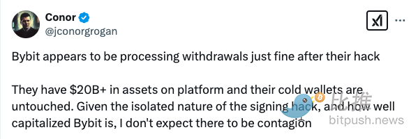 Coinbase高管 Conor Grogan在社交媒体上发文力挺 Bybit:“Bybit 在遭到黑客攻击后,提款似乎一切正常。他们在平台上拥有超过 200 亿美元的资产,他们的冷钱包毫发无损。鉴于签名黑客攻击的孤立性质以及 Bybit 的资本实力,我预计不会出现传染。”