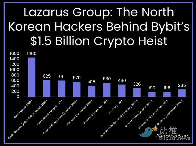根据10x Research统计数据,此次 Bybit 交易所被盗的 14.6 亿美元是加密交易所历史上规模最大的黑客攻击事件,第二大加密盗窃案是 2021 年Poly Network的 6.11 亿美元。此外,链上侦探 ZachXBT 已提交确凿证据,确认朝鲜黑客组织 Lazarus Group 是此次攻击的幕后黑手。