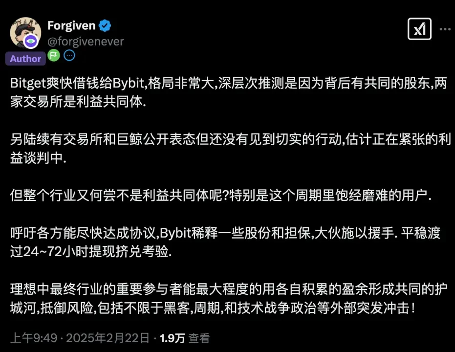 Bitget CEO Gracy 随后发推表示,Bybit 是值得尊敬的竞争对手跟合作伙伴,这次的损失虽然很大,但也就是他们一年的利润,相信客户资金是 100% 安全的,没必要恐慌和挤兑。其随后补充称,借给 Bybit 的资产是 Bitget 自己的,用户资产不会动。