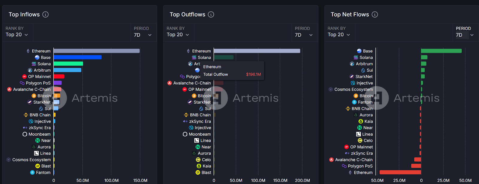 据artemis的数据显示,近7天内ETH的链上流出资金仅为1.96亿美元,流入资金量约为1.49亿美元。如果黑客选择在短时间内将这些资金转移至其他链上,则ETH的链上流出资金量短时间内或可能增长十倍左右。ETH链上深度在未来一段时间承压的现实就不可避免。