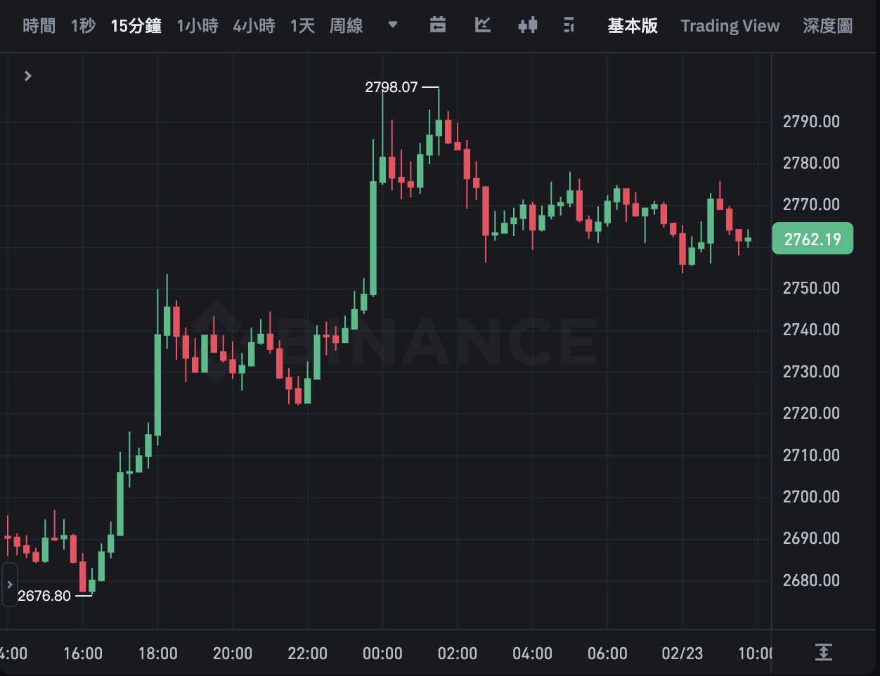 此消息一出,ETH 在 15 分钟内上涨 1.37%,并且攀升至最高 2798.07 美元,几乎收复 21 日 Bybit 遭骇后的跌幅。截稿前现报 2762.19 美元,近 24 小时上涨 3.13%。