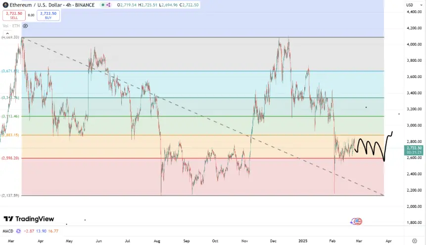ETH上周继续沿斐波那契回调线的2600~2900美元区域震荡,因此走势较容易判断,但凡反弹至2900美元附近出现滞涨形态,那么意味着小级别反弹结束,下行继续,支撑可继续关注2600美元附近,可以大概率确定的是,基本面若无太大波动,那么本周继续在上述区间震荡的概率偏高,跌破2520美元之前,不宜长期看空。