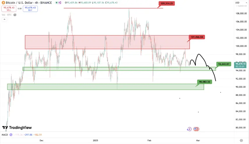 上周BTC如预期反弹受阻于10万美元阻力区间的底部位置,本周价格走势大概率继续向上测试98000美元附近一线阻力,但若无明显成交量放大形态,则向下测试95000美元的可能性无限升高,跌破94000美元或可直接关注90000美元底部支撑大关,若企稳于94000美元区域或继续围绕94000~98000美元区间盘整,提醒用户少动多看,现货继续持有,减少开合约的交易模式。