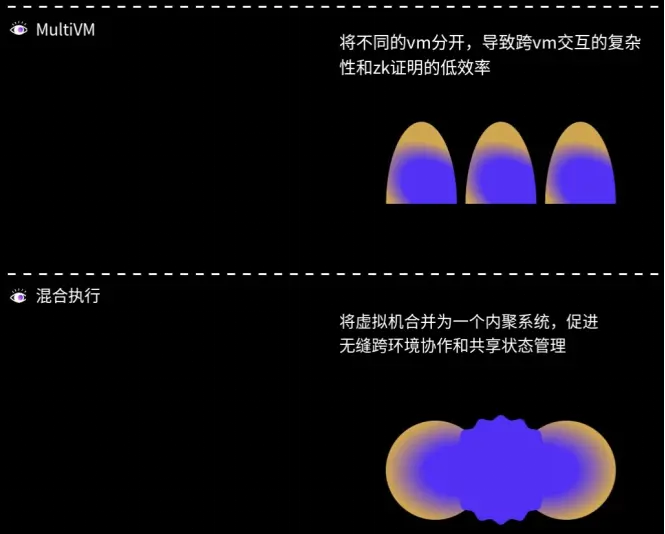 MultiVM 是一种替代虚拟机(altVM),在同一网络内使用多个独立的虚拟机。每个虚拟机独立运行,适用于不同的编程语言或执行环境。维护独立的虚拟机会带来复杂性,尤其是在状态同步和跨虚拟机交互方面。这可能导致开发者和用户体验的碎片化,因为不同环境之间的交互需要额外的协调。而混合执行(Blended Execution)相比 multiVM 提供了更为集成的方法。混合执行不是维护独立的虚拟机进行交互,而是将不同的虚拟机融合到一个统一的执行环境中。这允许多个虚拟机共享相同的状态,并在同一框架内无缝执行。从 zk 证明的角度来看,这也是最优的,因为最终只证明一个状态转换。实际上,主要的区别在于集成的程度。