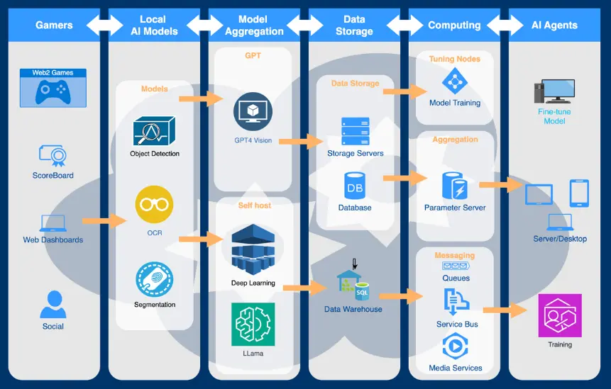 这一基础层是一个游戏化激励层,构建在Web2游戏之上,旨在进行数据挖掘。它提供实时跟踪、反应和对游戏内玩家行为的评分。系统实现了一个AI标签系统,用于处理游戏内的动作、决策模式和参与度。