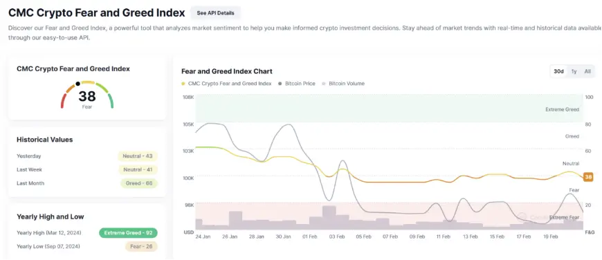 在2025年2月17日至2月23日期间,加密货币恐惧与贪婪指数从47下降至38,显示市场情绪从中性转为恐惧。 这表明投资者在此期间变得更加谨慎。 可能导致这一变化的因素包括: