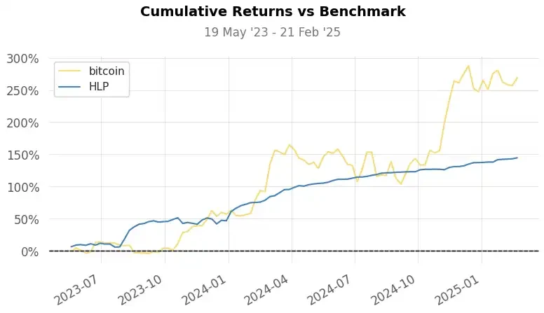 累计回报: 143% (HLP)vs 264% (BTC)