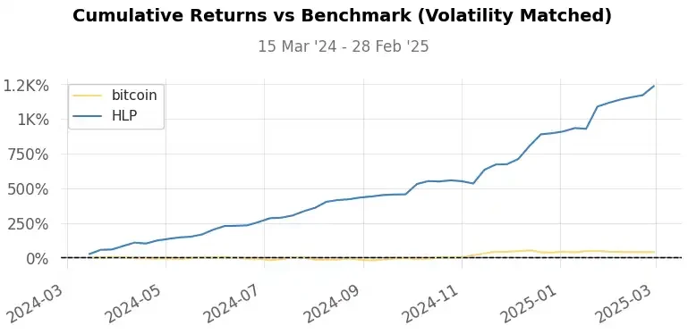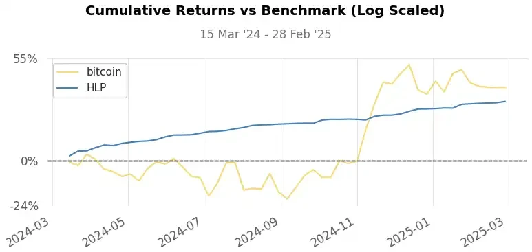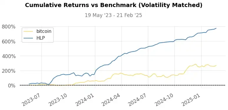 Sharpe 比率: 2.89 (HLP)vs 1.80 (BTC)