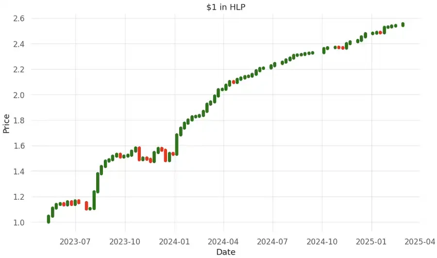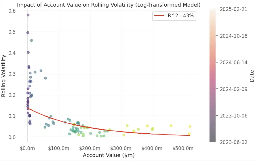 HLP 早期波动较高,随着 TVL 增长(目前已突破 5 亿美元),波动率持续收敛。
