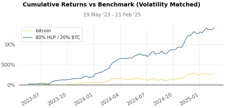 杠杆会同时放大收益和损失。由于 HLP 波动性更低,在达到与比特币同等风险水平前可承受更高杠杆(2.5 倍)。通过将 HLP 风险调整至与比特币波动率匹配,整体回报显著提升。