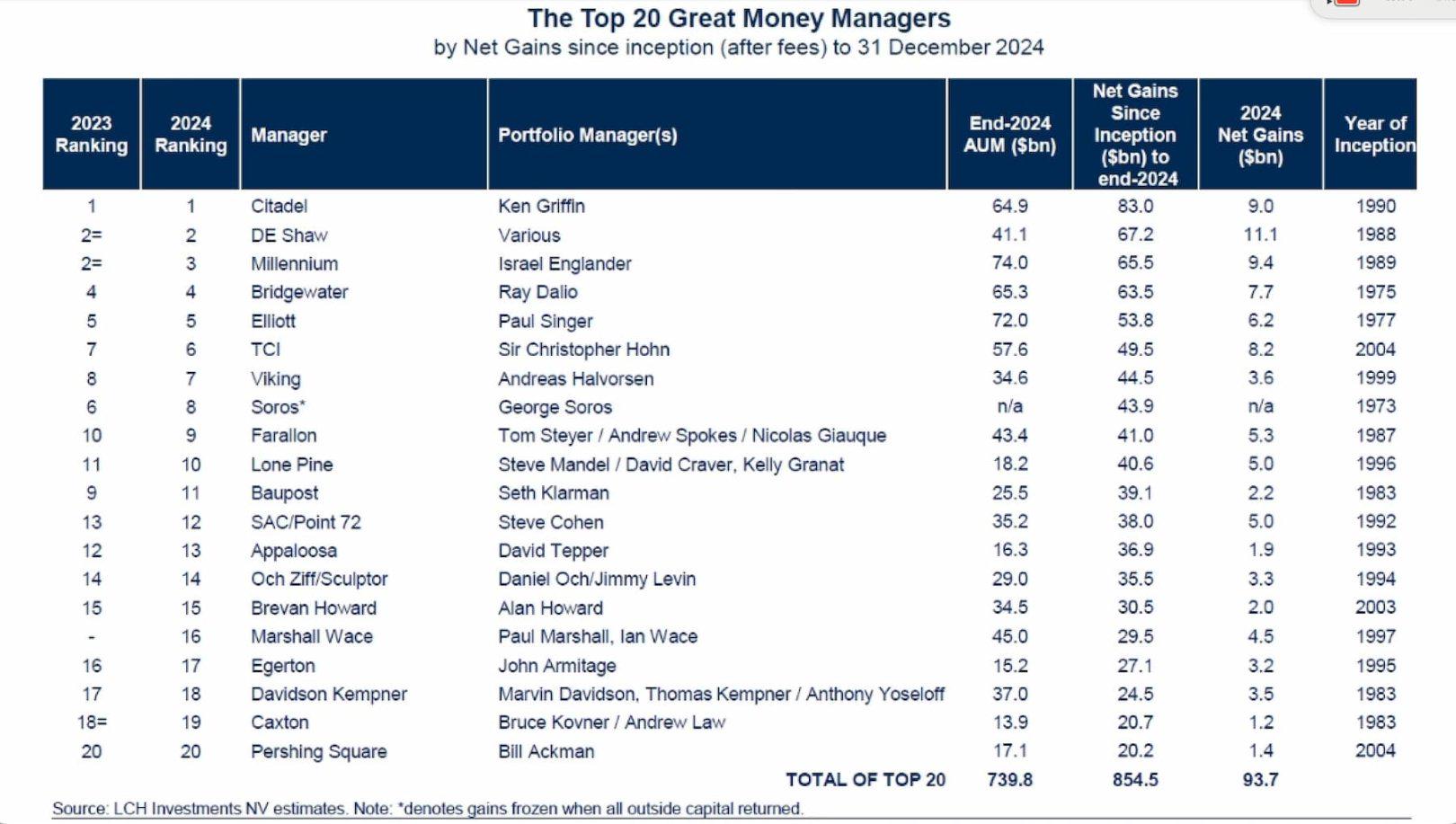 Citadel 在截至 2024 年年底的资产管理规模已高达 660 亿美元,另据 LCH Investments 统计,顶级对冲基金自启动以来到截至 2024 年年底,Citadel 的净收益最高,达到 830 亿美元,超越 D. E. Shaw、Millennium(千禧年管理公司)、桥水基金。