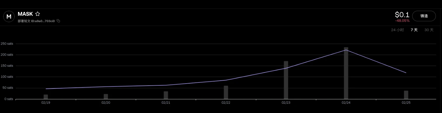2月23日MASK铸造进度达到70%,此时OKX铭文市场MASK单价为0.3美元。原本以为凭借社区情绪MASK会在2月24日铸造完毕并继续推高价格,但MASK热度的消退比预想中来得快,时至今日(2月25日),其进度仅达 88%,MASK单价下跌到0.1美元,回看 2月23日的价格已然是山顶。