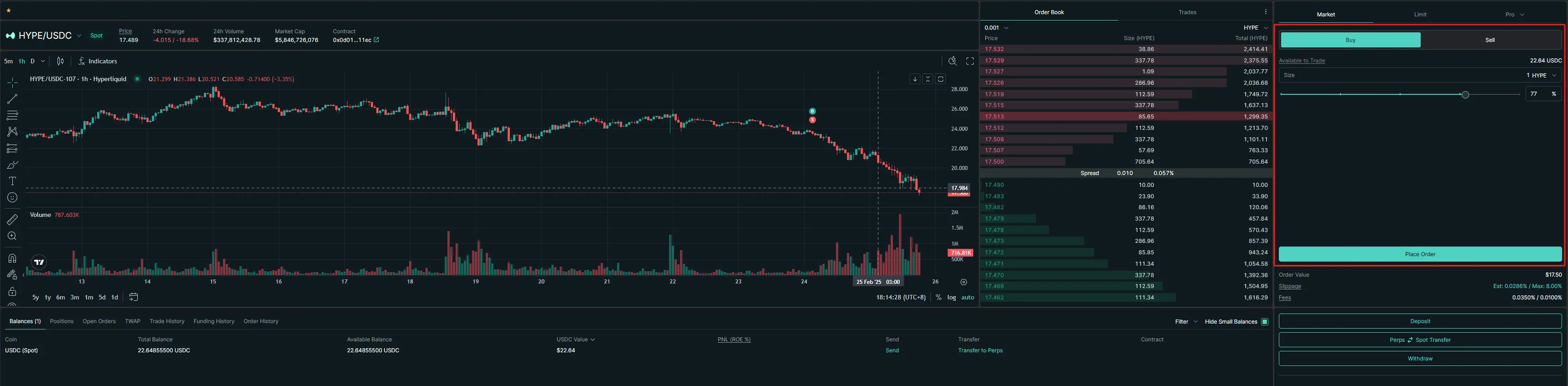 存款确认后,在 HYPE/USDC 交易对里购买 $HYPE: