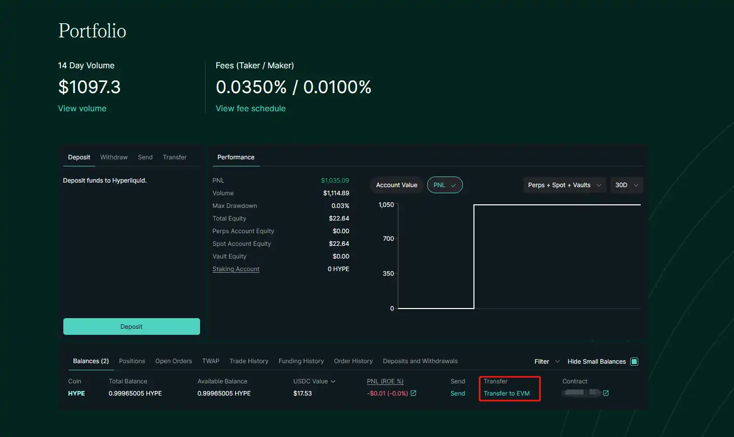 购买成功后,回到 Portfolio 页面,点击仓位里的 Transfer to EVM 把 $HYPE 提到 HyperEVM 上。