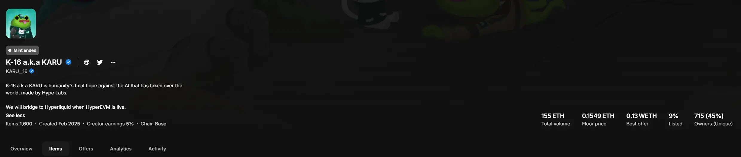 空投发放的对象是目前 Hyperliquid 上最火的 2 个 NFT 项目,Wealthy Hypio Babies 以及 K-16 a.k.a KARU,两者目前都在 Base 网络上,还没有桥接到 HyperEVM。
