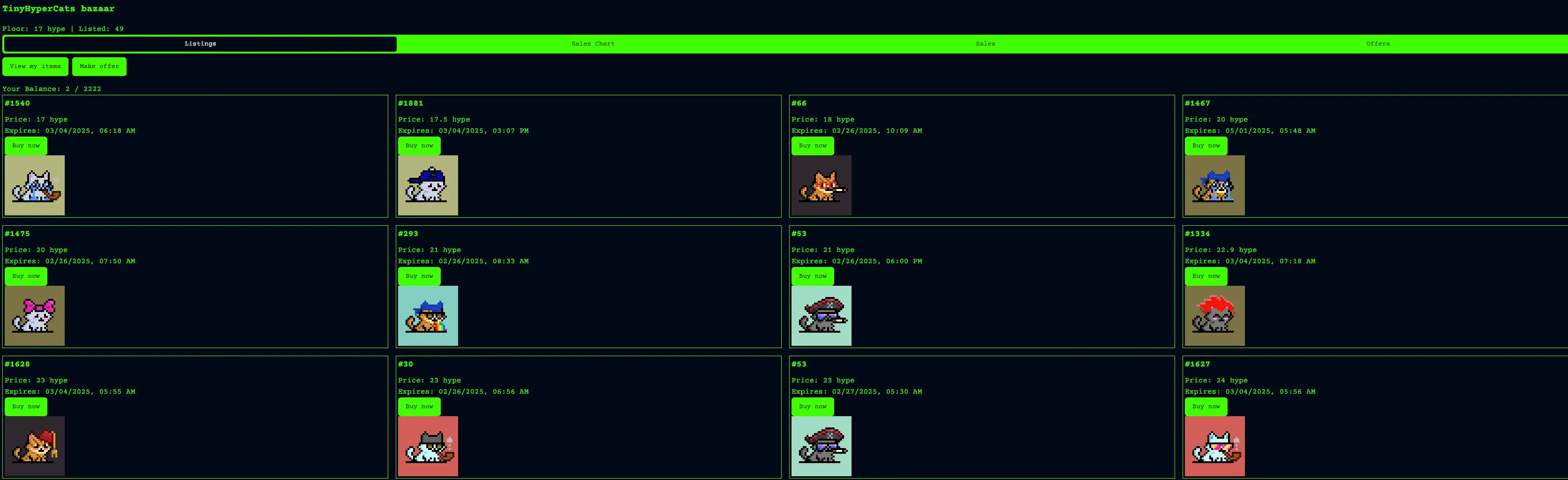 最后一个则是 HyperEVM 上第一个原生 NFT 项目 TinyHyperCats( @tinyhypercats ),因为是原生的所以目前需要在前面提到的 Net Protocol 上交易,目前的地板价是 17$HYPE。