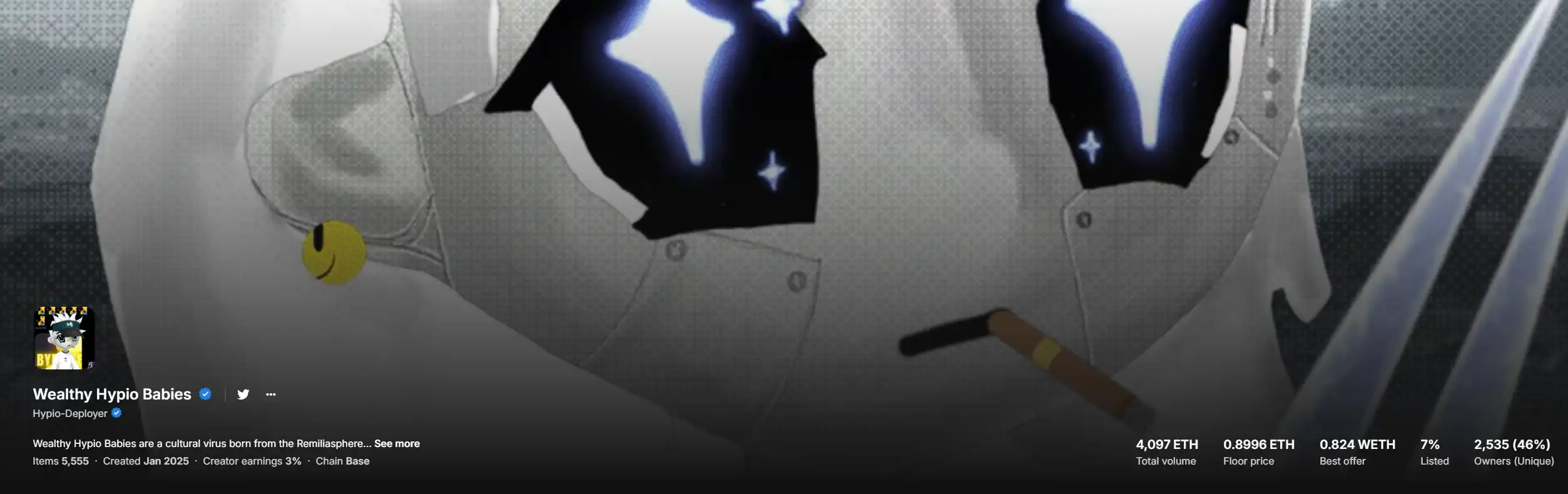 首先当然是 Wealthy Hypio Babies( @HypioHL ),目前的地板价大约为 0.9 ETH,从 ATH 的 1+ ETH 有所回落。不过市场现在都在下跌,回调也是情理之中。
