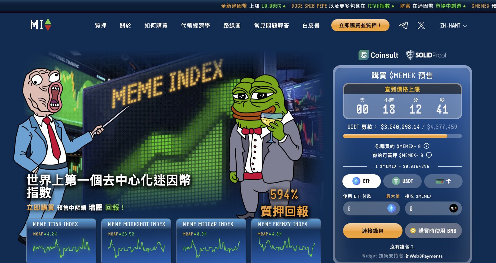 项目目前已售出380万美元,目前价格为$0.0164896,并随每一阶段上涨。此外为了保障投资者安全,Meme Index 已通过 Coinsult 和 SOLIDProof 智慧合约审计,进一步增强了市场信任度。目前,$MEMEX 预售正在火热进行中,投资者可以通过官方网站参与,使用 $USDT、$ETH 或 $BNB 购买代币。
