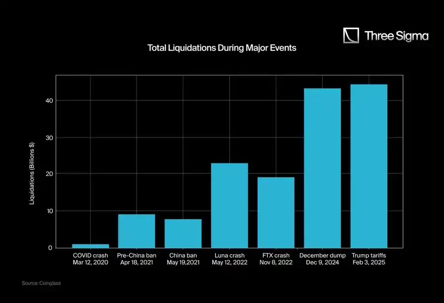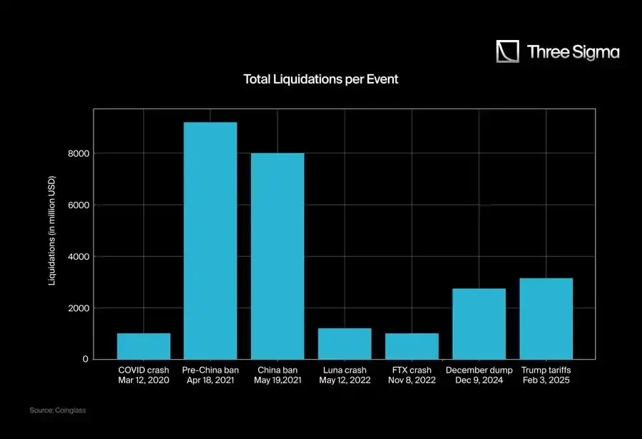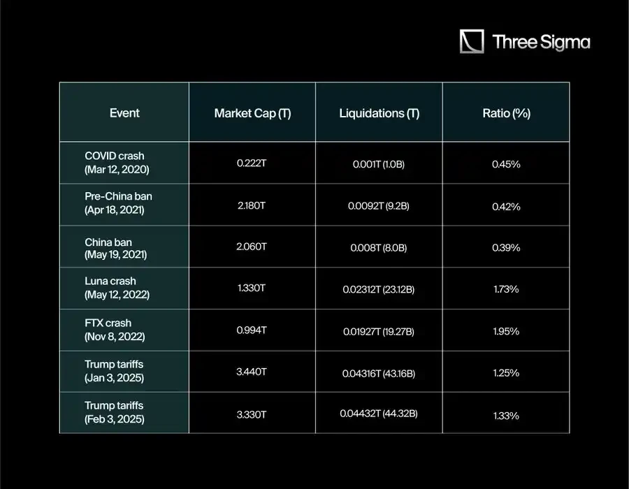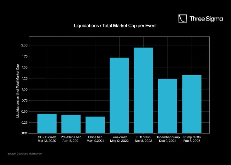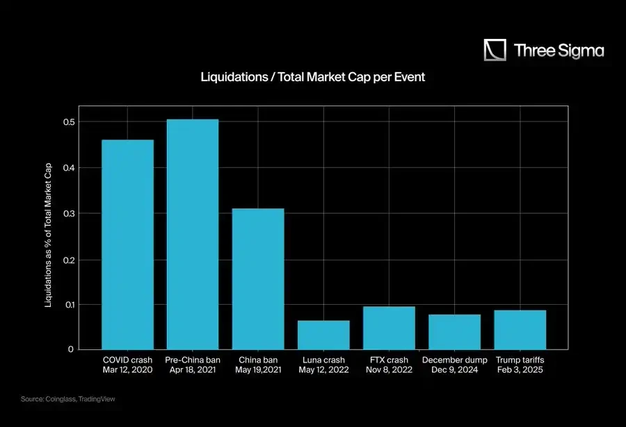 2020 年 3 月,整个市场的市值达到了 2660 亿美元,而到了 2025 年,市值峰值已达到 3.71 万亿美元。要真正理解这些爆仓事件的规模,我们应该考虑爆仓与市值的比率,而不仅仅看爆仓的绝对数字。单纯的数字可能让最近的爆仓看起来比实际情况更严重。