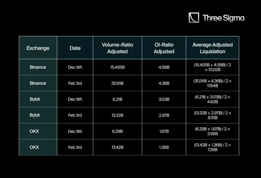 为了估算 CEX 的「真实」爆仓数字,我们将 Hyperliquid 的爆仓/交易量比率和爆仓/未平仓合约比率作为基准。接着,我们将这些比率与 CEX 在两个特定日期(12 月 9 日和 2 月 3 日)报告的数据进行比较,得出了一个调整因子。