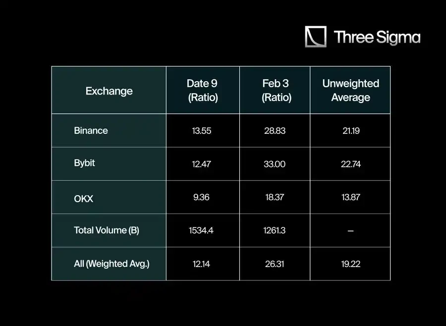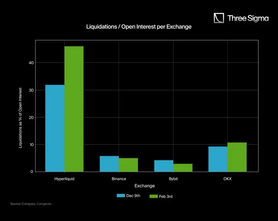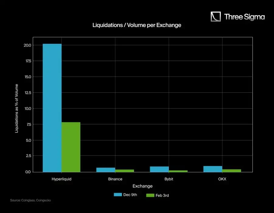 在将 Hyperliquid 的爆仓数据与主要 CEXs 报告的有限数据进行对比后,我们发现了显著的差异。为了量化这一差异,我们收集了 Binance、Bybit 和 OKX 在 12 月 9 日和 2 月 3 日的报告数据,特别分析了它们的爆仓/交易量和爆仓/未平仓合约比率。