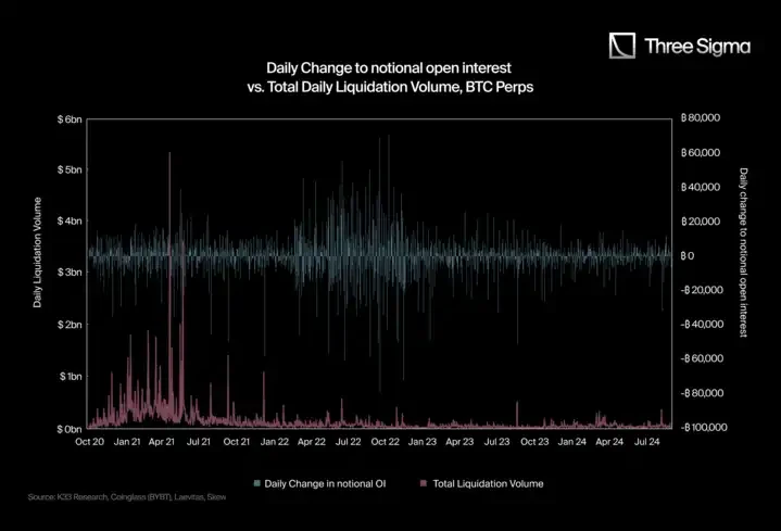 在第二个图表中,作者将总爆仓量与每日名义未平仓合约(OI)的变化进行了比较。