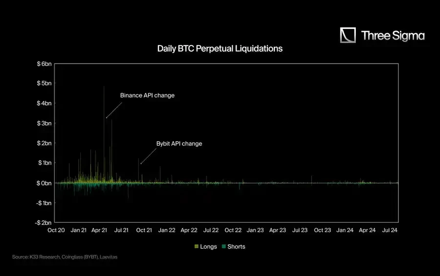 名义未平仓合约的巨大日内波动通常会引发大量爆仓,但正如我们在图表中看到的那样, 2021 年第二季度之后,在出现如此大幅度 OI 波动的日子里,并没有出现爆仓的明显激增。