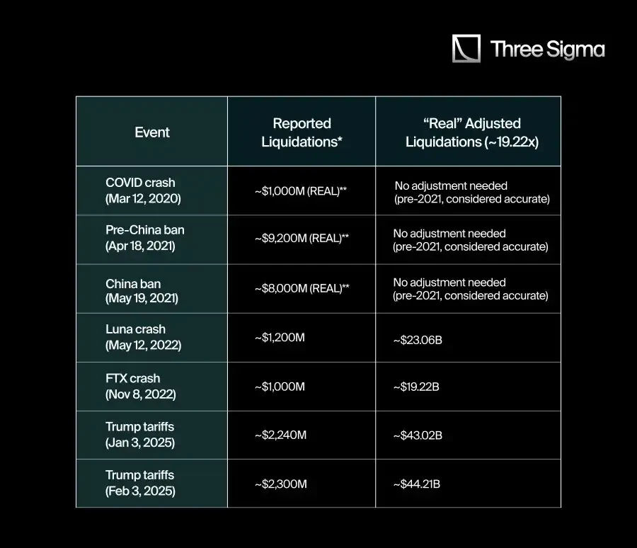 有了这个 19.22 倍的调整倍数,我们分析了加密历史上一些重要的清算事件,以估算如果它们像 Hyperliquid 那样具有相同透明度,其真实的清算数据可能是多少。下表比较了常见的清算金额与使用修正后的 19.22 倍调整后的数值:
