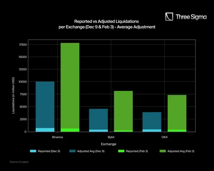 Bybit 和 OKX 也遵循同样的模式:Bybit 在 2 月 3 日的调整后爆仓数据为 8, 150 M,而不是报告的 247 M;12 月 9 日为 4, 620 M,而非 370 M。OKX 也显示出显著的差异, 2 月 3 日的调整后爆仓数据为 7, 390 M, 12 月 9 日为 3, 980 M,而其报告的分别为 402 M 和 425 M。