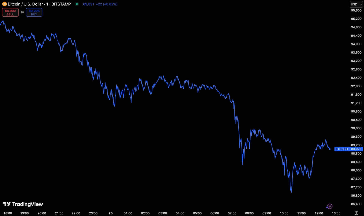 在 昨天的报告 中,我们探讨了过去几个月加密货币市场发生的若干结构性变化。如今,美国市场尚未开盘,加密领域总市值已下挫近9%,比特币过去24小时跌幅超7%。尽管比特币在触及87000美元上方新低后反弹至89000美元关口,但当前走势已显露疲态。