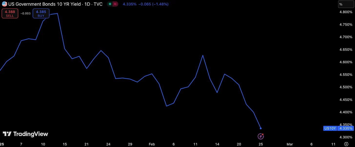 加密货币与美股双双表现疲软,或与特朗普政府政策重心转向压低债券收益率而非推升股市密切相关(更不要说比特币价格,实际上白宫对加密市场的整体表现鲜有关注)。若将压低债市收益率视为政策成功的衡量标尺,那么当前境况或许比单纯以股市表现评判时的观感更为乐观。