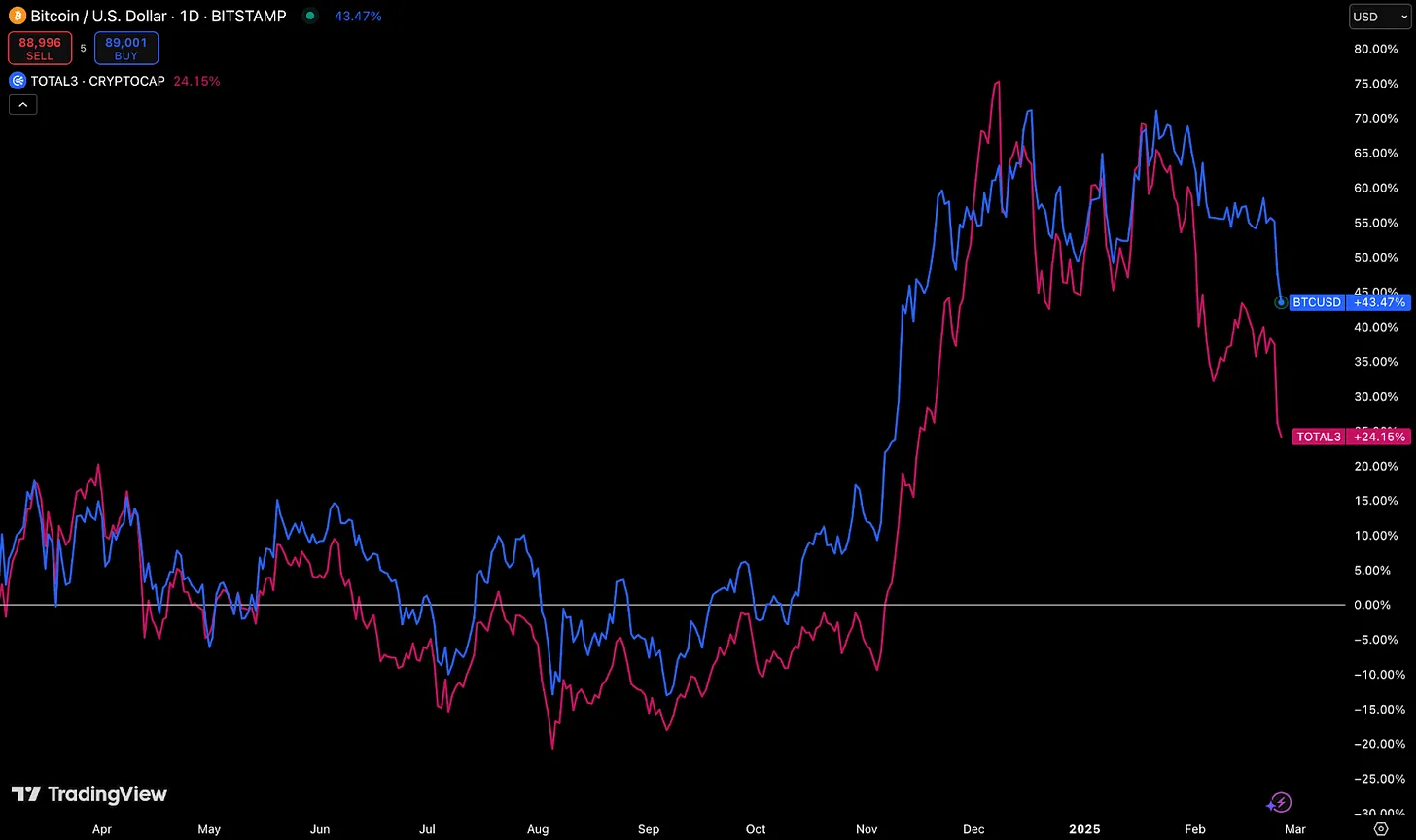 市场向来厌恶不确定性,而特朗普政府上任首月便充分展现了制造不确定性的能力。年初至今,美股表现逊于欧股及中概股,纳斯达克指数几近跌入负区间。这或许能合理解释加密货币一季度为何表现低迷: 尽管Michael Saylor的"战略囤币"带来了流动性支撑及ETF资金流入,仍使比特币保持相对高位,但整体加密市场表现仍呈现大幅落后态势。