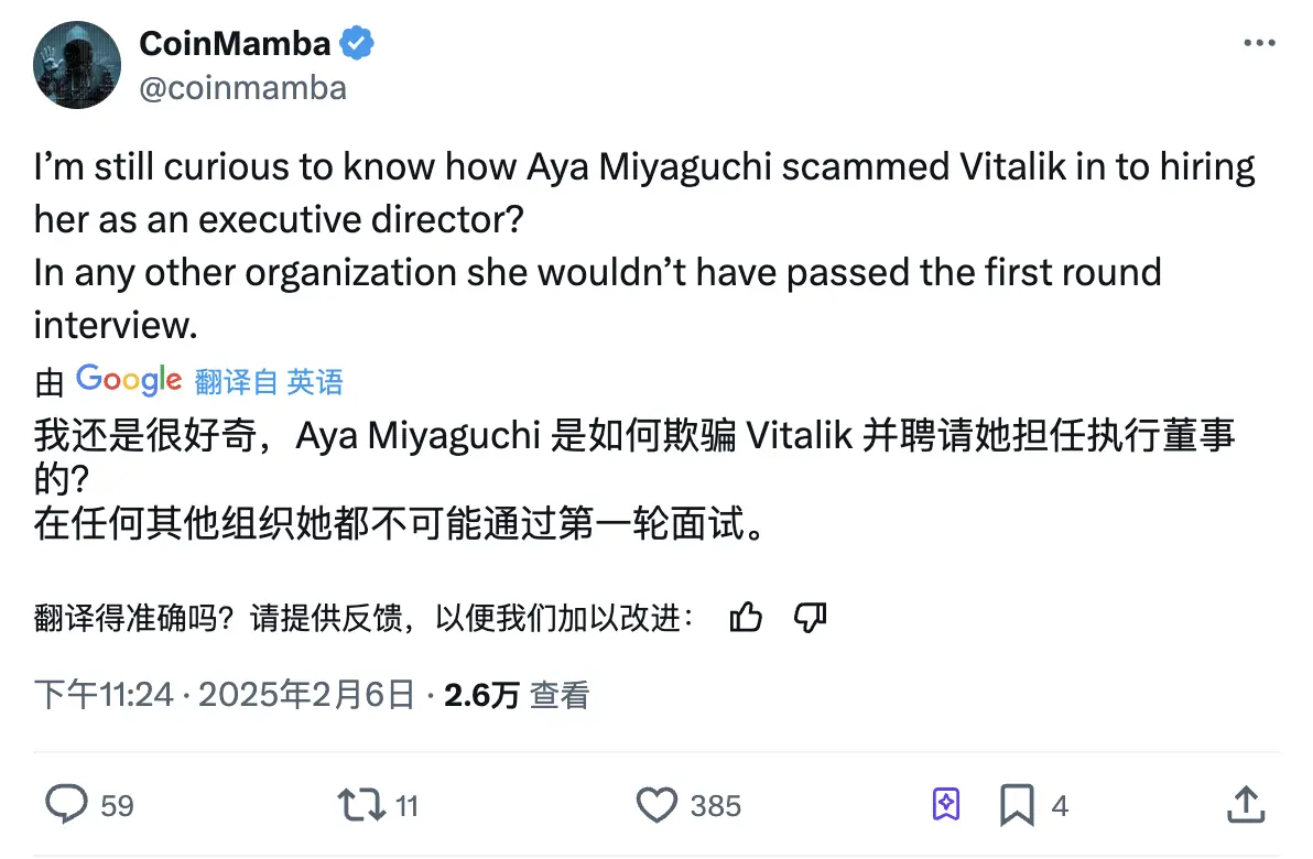 尽管有上述批评,Vitalik Buterin 在 X 上积极为 Aya 辩护,强调她在推动以太坊升级、Devcon 活动和维护以太坊文化方面的贡献,并批评社区的攻击行为“令人反感”。
