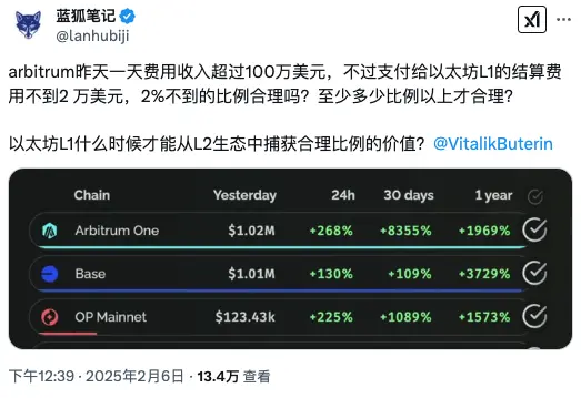Arbitrum 都要向自己的 L3 收取 10% 的手续费,作为 L2 却只给以太坊 2% 的「税」,这让很多投资者和生态开发者产生了质疑,这个比例实在是太低了。